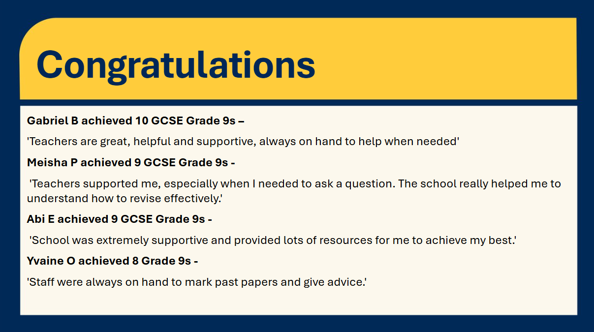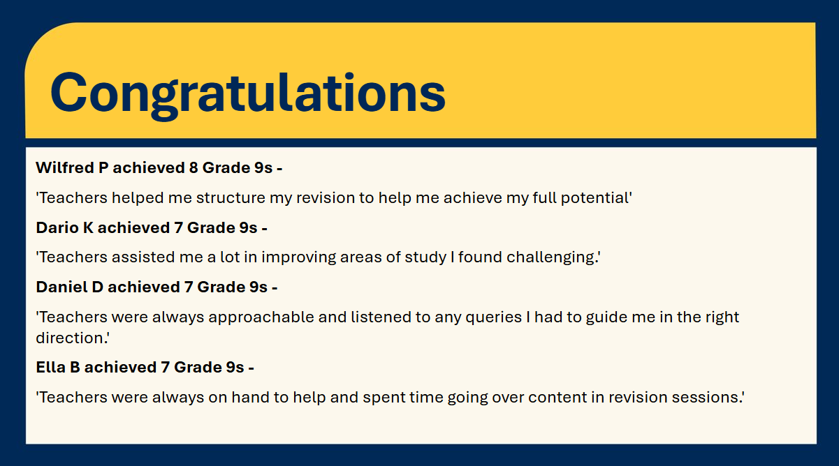 Congratulations to all of our Year 11 students on their GCSE results. They are a tribute to their hard work and dedication, from both students and staff.  Our Year 11 teachers have gone above and beyond to deliver high impact revision lessons to prepare their students for the GCSE examinations.