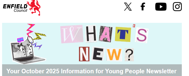 The latest opportunities in Enfield for Young People click on the link to this month's newsletter which includes information on Black History Month celebrations as well as how to get involved in education and raising awareness of ending violence against women and girls as part of November's White Ribbon Day campaign.