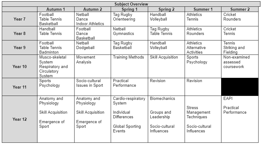 Physical Education is a core practical subject for students in Years 7-11. Students can choose GCSE Physical Education (AQA) as an option at the end of Year 9 and A-Level Physical Education (OCR) in Year 12.